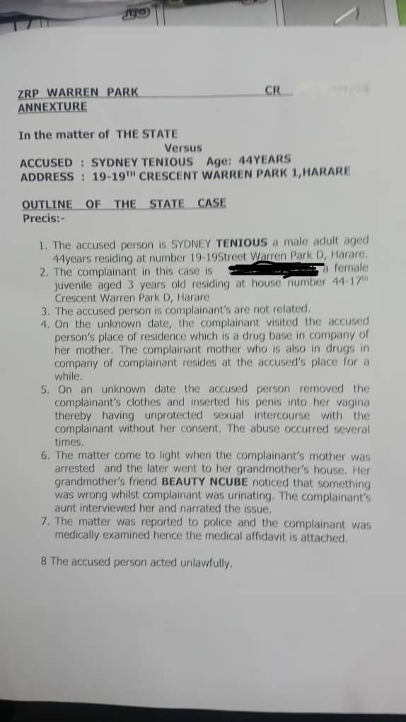 The minor, whose name has been withheld, reportedly visited a residence in Warren Park 1 in Harare, accompanied by her mother (name withheld) who is alleged to have been struggling with substance abuse.