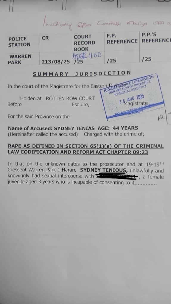 Charge sheet lists the accused as Sydney Tenious, 44, of 19th Street, Warren Park D, a detail that contradicts records identifying Sydney Makaya, 52, of 19th Crescent, Warren Park 1.